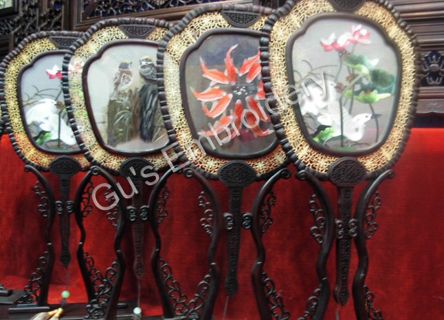 all the pictues showed in this page are all double side embroideries.Some is small as A4 size paper, some is as tall as an adult.Double side means that you may appreciate the embroidery from two sides,some can be reversed. Some of the stands of the embroidery are made with rose wood.